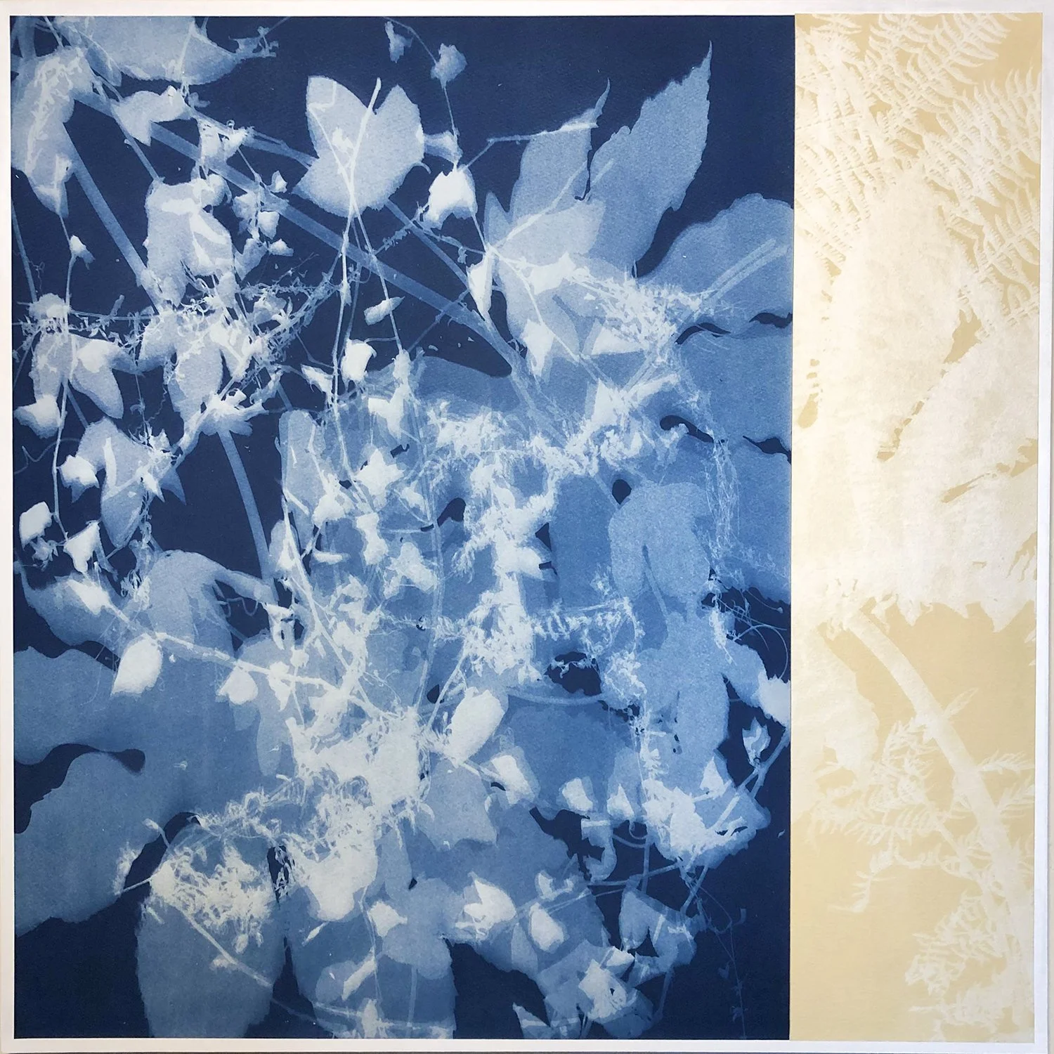 Christine cycles between printmaking, collage and painting, transfering effects from one to the other. Her favorite question when working with cyanotypes is “What would happen if…?” The soft multiple shades of blue from overlapping images in “Light through Leaves” come from her experimenting with multiple exposures of one plant. A range of techniques are on display among her works in this photo gallery: multiple-exposure cyanotypes from photo negatives, prints which combine solid objects with photo negatives, cyanotypes in which the darkening process was interrupted by water, completely abstract cyanotypes, blue prints bleached yellow, green cyanotypes made by printing a blue over a yellow print and cyanotype paintings drawn with emulsion whose shapes were then filled with sun-printed patterns.